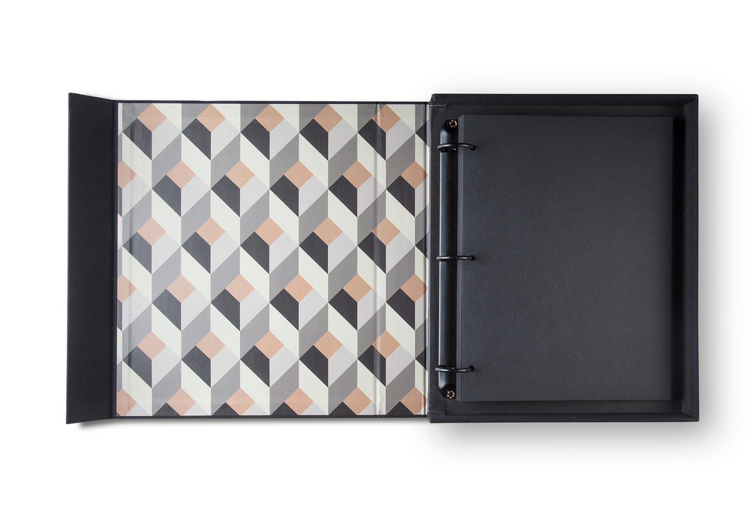 Material: Cover: 100% Cotton fabric + recycled greyboard. Pages FSC, acid free black card. Black metal binder.